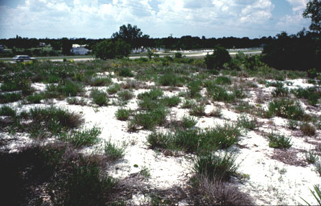 This tiger beetle occurs only in Highlands and Polk counties in the central region of Florida. It lives in sparsely vegetated scrub consisting of palmetto, rosemary, and scrub oak (see below). Both the adults and immature stages are predacious and feed on other insects. Populations of this beautiful beetle are small and scattered. The destruction of habitat has caused this species to be considered for "Endangered species" status. Researchers for The Nature Conservancy have documented populations in both counties. (Photo by Paul Choate)
